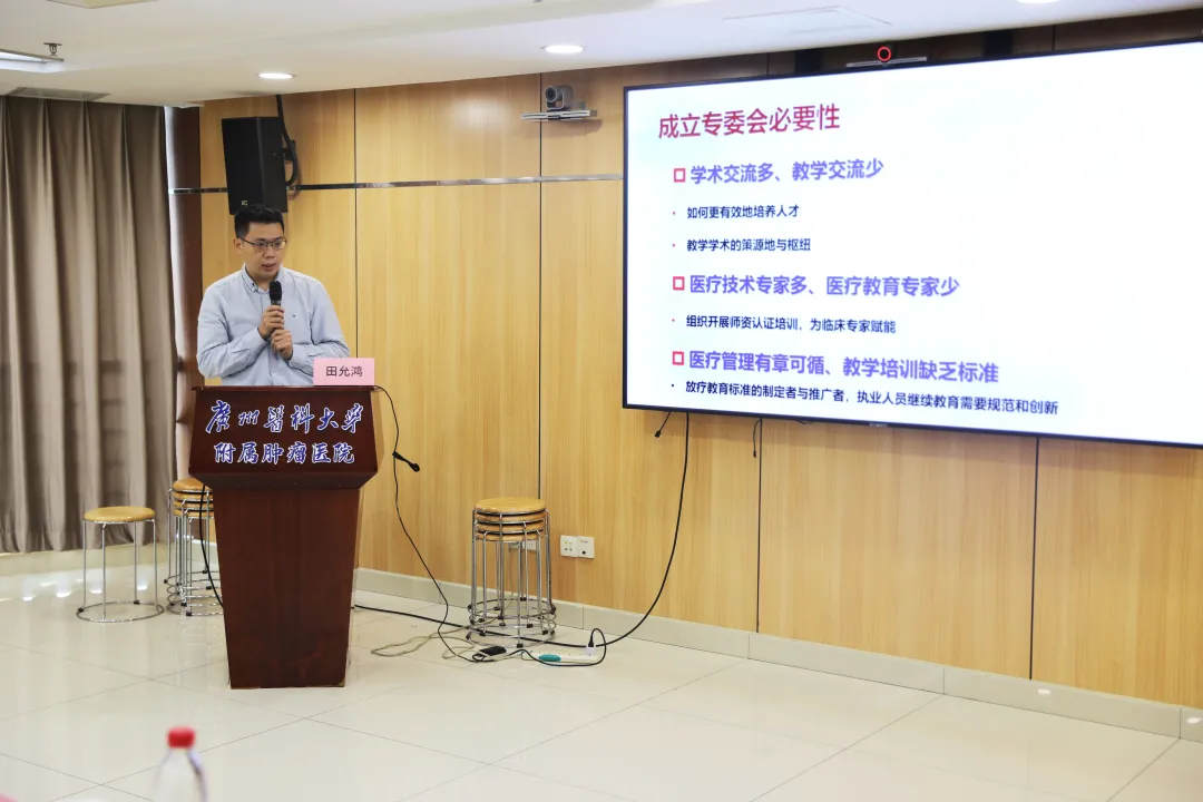 广东省医学教育协会会长兼考察组组长罗良平、医学教育专家委员会主席周增桓、副会长兼秘书长李海燕、副秘书长于淼、业务部部长邬冰彬,广州医科大学附属肿瘤医院党委书记林英、副院长郑国沛、内科一区主任李卫东、胃肠外科二区主任王进、放疗科主任田允鸿等相关工作人员参加了此次活动。会议由副秘书长于淼主持。