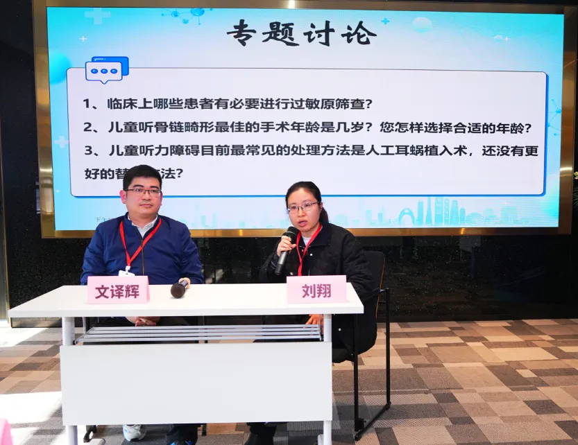 第一轮专题讨论环节中,中山大学附属第一医院文译辉教授与中山大学附属第二医院刘翔教授围绕“临床患者与过敏原筛查”、“儿童听骨链畸形最佳的手术年龄”、“儿童听力障碍目前最常见的处理方法”等议题展开深入交流。