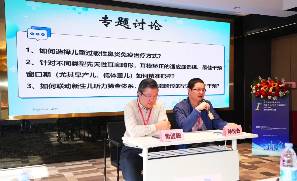 第二轮专题讨论环节中,来自中山大学附属第三医院的黄健聪教授与中山大学附属第六医院的孙悦奇教授就“儿童过敏性鼻炎免疫治疗方式”,“精准把控先天性耳廓畸形与耳膜矫正”,“耳廓畸形联动新生儿听力筛查体系”等议题展开讨论。专家们围绕临床难点各抒己见,精彩纷呈。